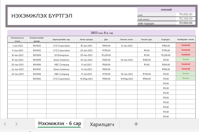 Нэхэмжлэх бүртгэл₮ 6,500 - Нэхэмжлэх бүртгэл тоо ширхэг + Захиалах Categories: Бүртгэл, Санхүү Related products Мөнгөн гүйлгээ – Төлбөр төсөв төлөвлөгөө ₮ 12,000 Захиалах Ашиг алдагдал тооцоолуур ₮ 10,500 Захиалах Ерөнхий журнал ₮ 6,500 Захиалах Ажилтны цалингийн хүснэгт ₮ 7,500 Захиалах