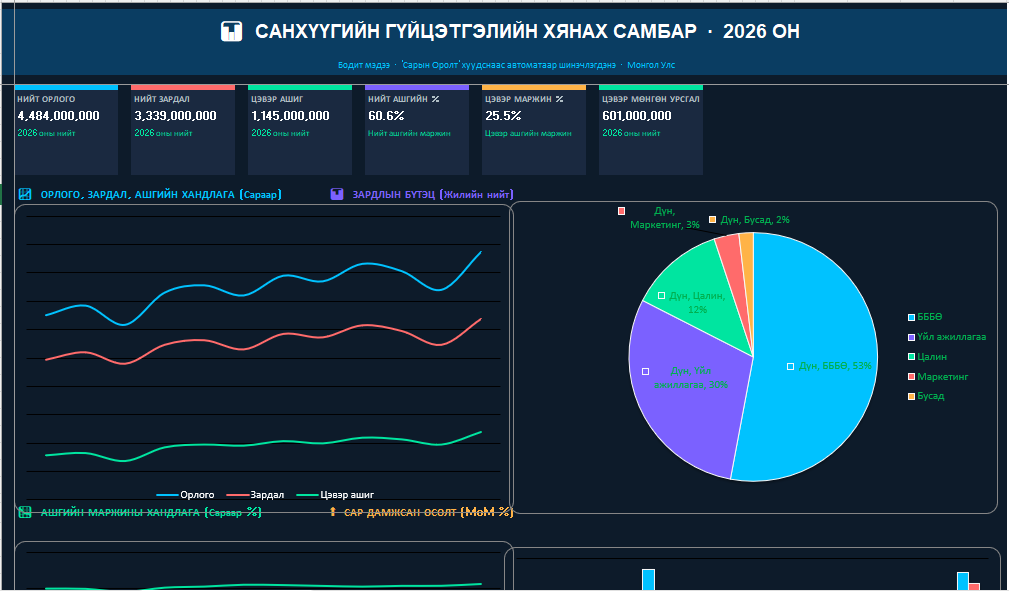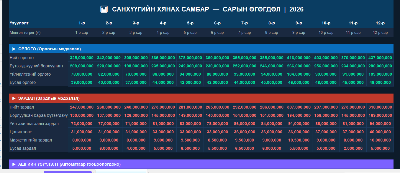 Санхүүгийн хянах самбар₮ 15,000 - Санхүүгийн хянах самбар тоо ширхэг + Захиалах Categories: KPI, Анализ, шинжилгээ, Санхүү Related products Харьцааны шинжилгээ ₮ 6,500 Захиалах Онлайн дэлгүүрийн ашиг алдагдал ₮ 7,500 Захиалах ABC-XYZ шинжилгээ ₮ 7,000 Захиалах Хүний нөөцийн эргэлт | HR Turnover ₮ 6,500 Захиалах