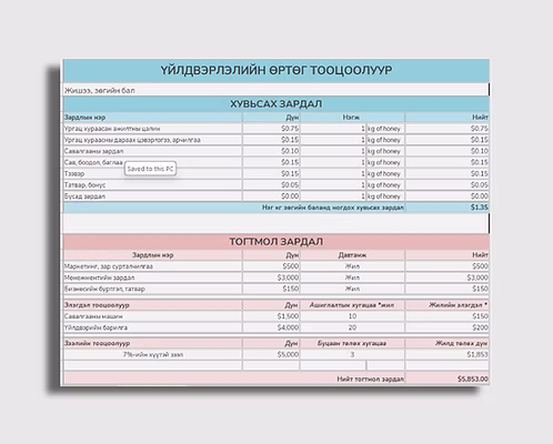 Үйлдвэрлэлийн өртөг тооцоолуур₮ 9,900 - Үйлдвэрлэлийн өртөг тооцоолуур тоо ширхэг + Захиалах Categories: Санхүү, Тооцоолуур, Үйл ажиллагаа Related products 12 сарын мөнгөн гүйлгээний тооцоолол ₮ 7,500 Захиалах Зардал төлөвлөгч ₮ 6,500 Захиалах Ажилтны цалингийн хүснэгт ₮ 7,500 Захиалах Мөнгөн гүйлгээ – Төлбөр төсөв төлөвлөгөө ₮ 12,000 Захиалах